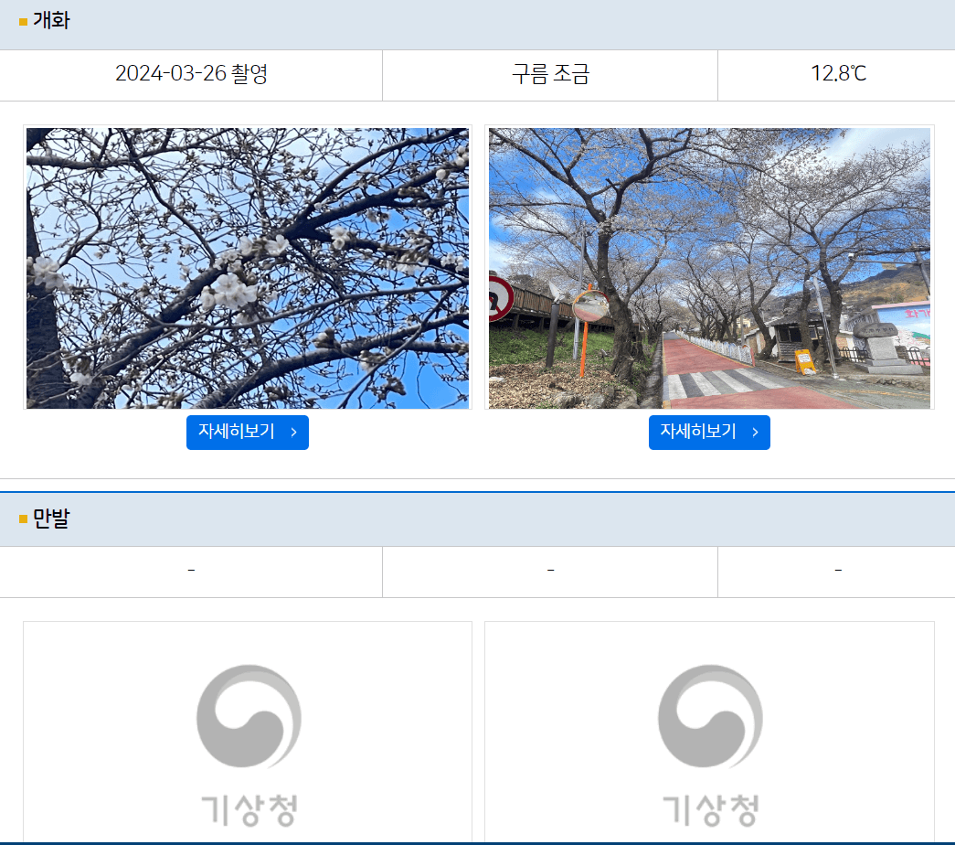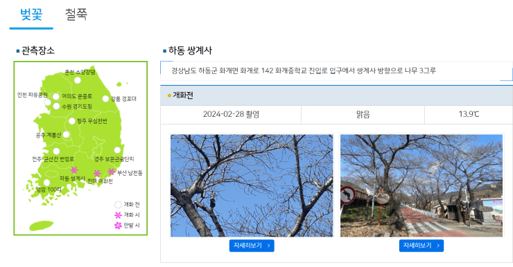 ⑤지도에서 벚꽃장소 클릭시 개화 전, 개화 시, 만발 시 일자별 사진 확인가능