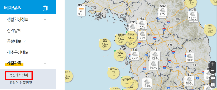 ③계절관측 → 봄꽃개화현황 클릭 (가을철 유명산 단풍현황도 같은 곳에서 확인가능합니다)