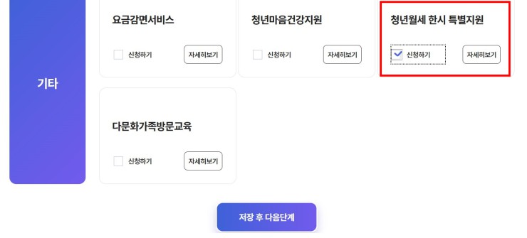 서비스 신청 → 복지급여 신청 → 스크롤 하단으로 내려서 기타 항목 → 청년월세 한시 특별지원 클릭 → 저장 후 다음단계 → 신청완료 (지원 후 심사 및 조사를 통해 지원 합격 여부 결졍)